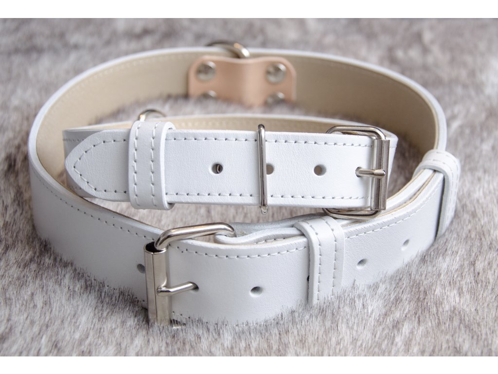 Vyrábím jej z pořádného matroše. Žádné namleté zbytky kůží všeho druhu opatřené barvou a tunou lepidla, kdy z toho už moc přírodního není. Základem je tedy plnohodnotná hovězí kůže s označením Full-grain nebo Top-grain. Obojí je prvotřídní materiál zvaný hovězí kůže/useň. Nic lepšího není. Obojek je podšitý další vrstvou kůže, v tomto případě buďto hovězinkou, kozinkou nebo vepřovicí. Záleží na barvě atp. Každopádně ta milimetrová kůže tam dole je. Slepeno a prošito, aby to drželo pohromadě velmi dlouho. Zde samozřejmě záleží na péči o výrobek i psa. Pokud jej necháte na krku pejska i když se prodírá živým plotem kolem baráku, dlouho nevydrží.