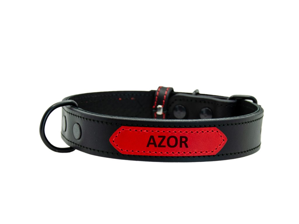 Na bocích obojku je přichycen menší kožený štítek, kam lze uvést jméno a/nebo kontakt na majitele pejska. V kontrastu s barvou kůže to působí velmi zajímavě.